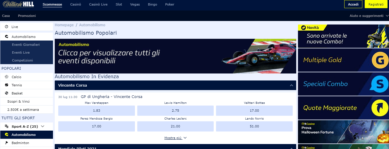 William Hill è anche competitivo con le sue quote e con le offerte sulle quote maggiorate e quote boost. Parliamo di uno dei top bookmakers di 123scommesse e quindi in termini di siti scommesse motori è una delle nostre prime scelte.